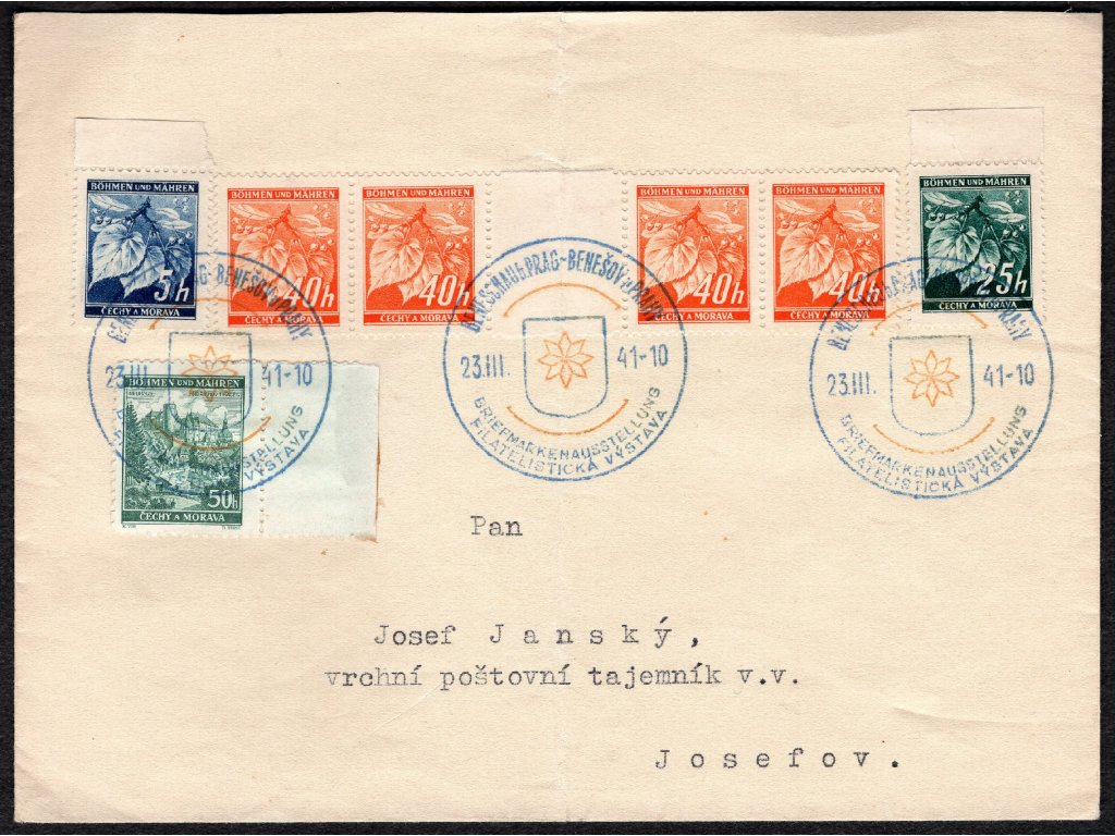 BuM 1941, ⌧︎ nouzová obálka (přeložená), správně vyplaceno jako těžší dopis (2,40 Kč), datum 1. den O