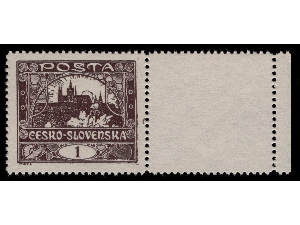 ČSR I 1918, Pof. 1C, xx 1 h Hradčany, ZP 60/2, s DV (čárkou) na pravém okraji, s "kuponem"