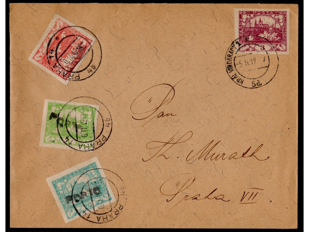 ČSR I 1919, ⌧︎ s výplatní a třemi nouzovými doplatními Hradčany, podací a dodací razítko