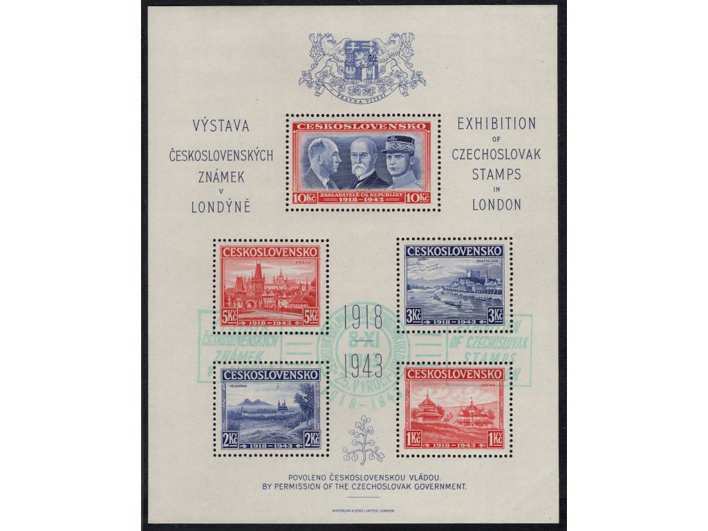 ČSR I 1943, O Londýnský aršík, desky CC, stádium perforačního rámce č. 1, strojové razítko - vodorovně, svěží lep