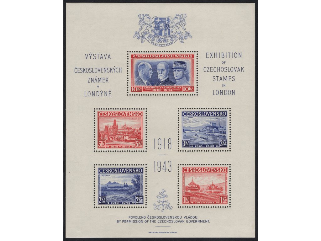 ČSR I 1943, xx Londýnský aršík, desky A/C, stádium perforačního rámce č. 5, méně běžná kombinace