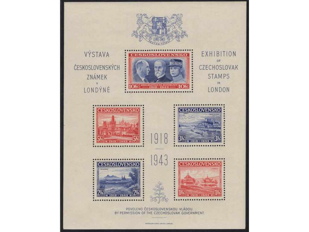 ČSR I 1943, xx Londýnský aršík, desky B/D, stádium perforačního rámce č. 3, nahnědlý lep, skvrnka, vlevo stopa čárky rozměřovacích křížků