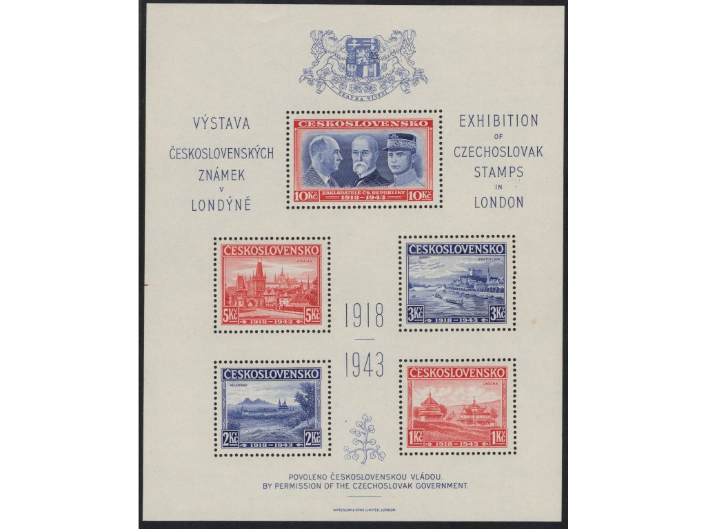 ČSR I 1943, xx Londýnský aršík, desky C/C, stádium perforačního rámce č. 3, skvrnka