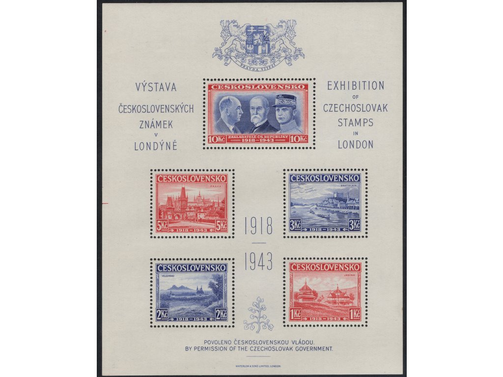 ČSR I 1943, xx Londýnský aršík, desky C/C, stádium perforačního rámce č. 4, méně běžná kombinace, vlevo čárky rozměřovacích křížků