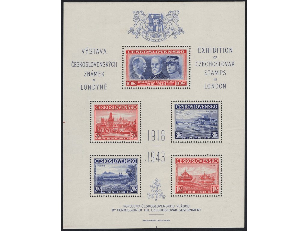 ČSR I 1943, xx Londýnský aršík, desky C/C, stádium perforačního rámce č. 5, málo běžná kombinace, dole čárky rozměřovacích křížků