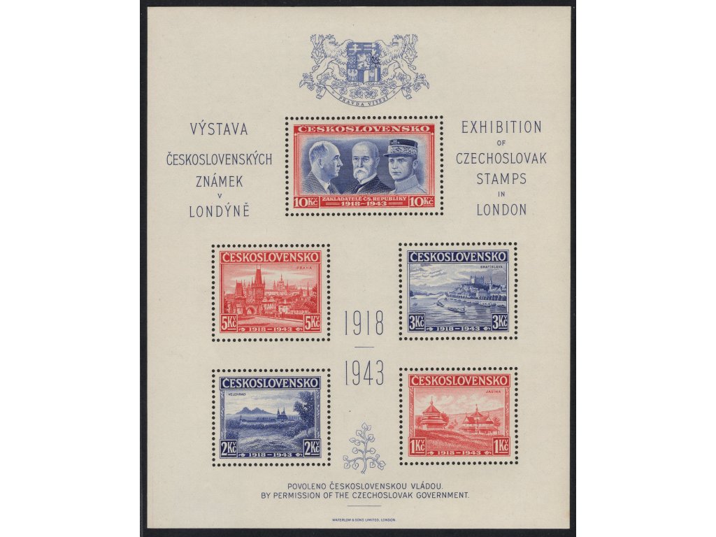 ČSR I 1943, xx Londýnský aršík, desky D/D, stádium perforačního rámce č. 3, nahnědlý lep