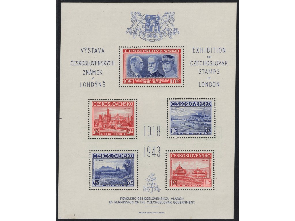 ČSR I 1943, xx Londýnský aršík, desky D/D, stádium perforačního rámce č. 7, vlevo dole čárky rozměřovacích křížků