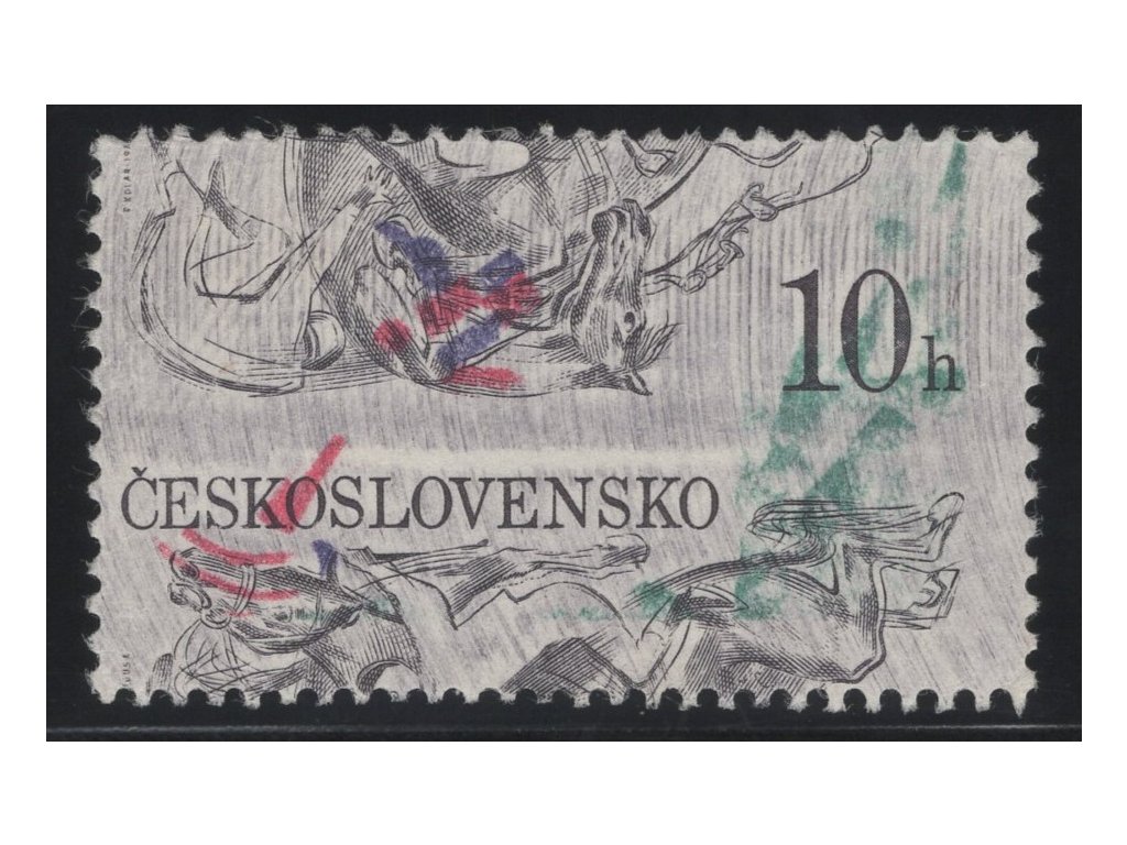 ČSR II 1978, Pof. 2340, (x) 10 h Dostihy, silný posun HT barev, silně posunuté zoubkování - název státu uprostřed obrazu, místo nahoře, celá plocha "šrafovaná" černou OTr barvou