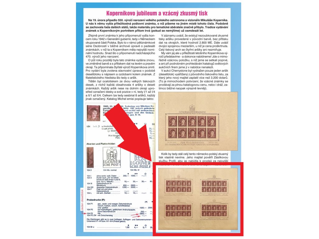 Katalog Michel vede jen jednotlivé známky a jednotlivé aršíky (cena proškrtnuta), celý tiskový list se čtyřmi aršíky nebyl v posledních mnoha letech nabízen v žádné aukci u nás ani v zahraničí (resp. se nám takovou nabídku nepodařilo dohledat), prvotřídní rarita - zřejmě dokonce unikát! (jde o exemplář popsaný a vyobrazený ve Filatelii č. 3/2023 a vystavený na výstavě Rarity a příběhy pořádané Odbornou společností filatelistických studií SČF v listopadu 2024 v Praze)