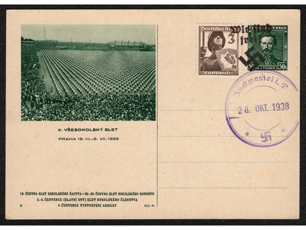 Sudety 1938, CU čs příležitostná dopisnice s přítiskem WSF a razítkem Zuckmantel (Zlaté hory)