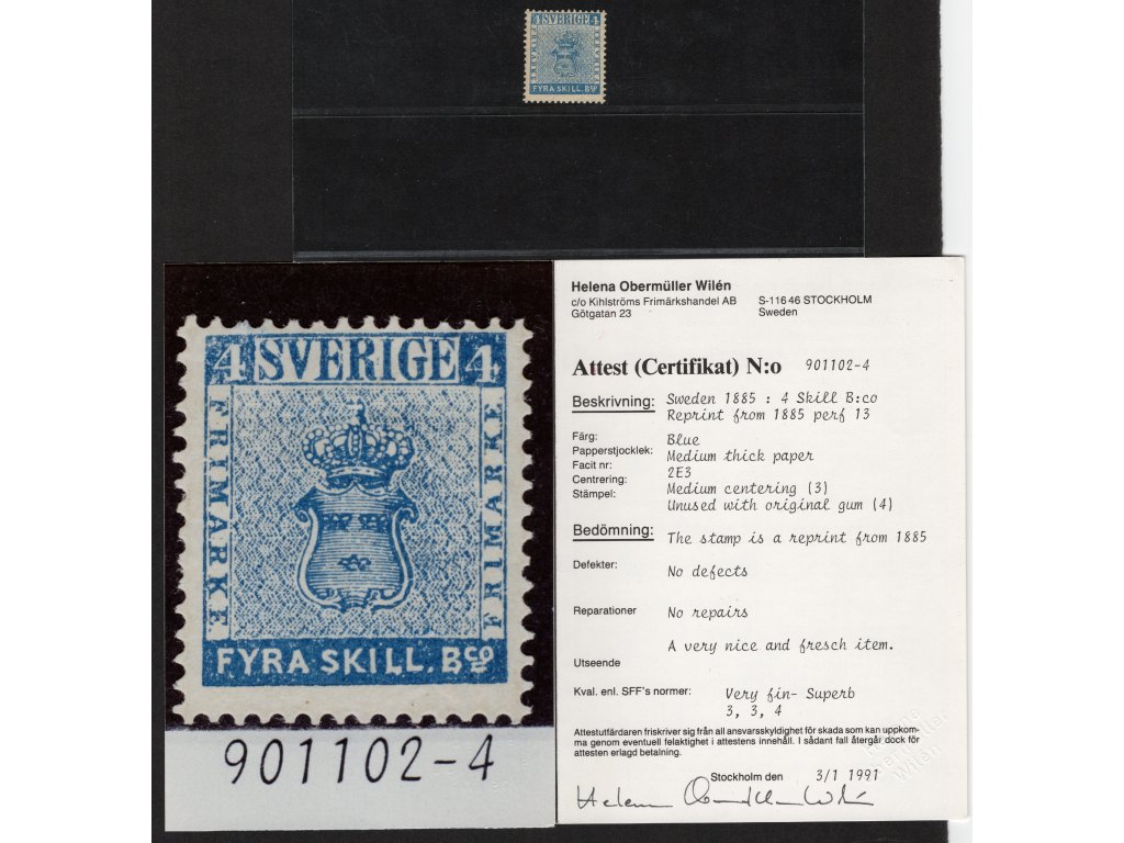 Švédsko 1855, Mi. 2 - novotisk z roku 1885, x 4 sk, fotoatest