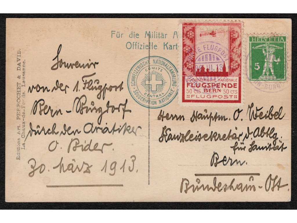 Švýcarsko 1913, Mi. III, ⌧︎ příležitostná letecká pohlednice, raz. 30.3.1913 - FDC!