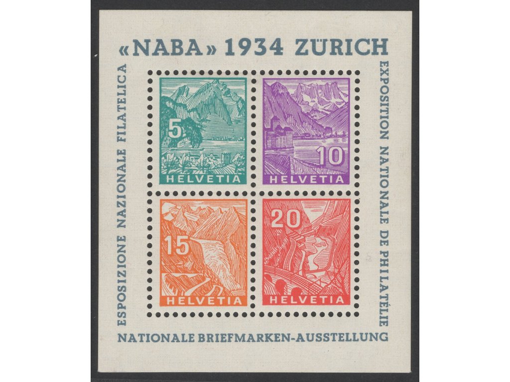 Švýcarsko 1934, Mi. Bl. 1 (271-4), x aršík NABA, těžší stopy po nálepkách